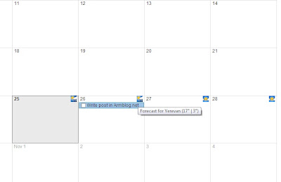 Կարծում եմ շատերն են օգտվում Google ընկերության օրացույցից, որը իրենից ներկայացնում է առաջադրանքներ և հանդիպումներ հիշեցնող ծառայություն: Այն թույլ է տալիս պլանավորել գալիք օրերը և բաց չթողնել ոչ մի կարևոր իրադարձություն: Այժմ տեսնենք, թե ինչպես այդ օրացույցում ավելացնել գալիք օրերի եղանակի տեսության մասին ինֆորմացիա: