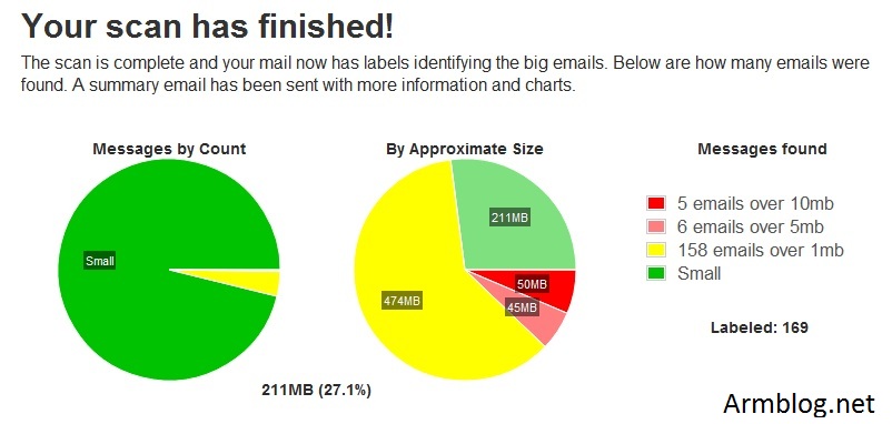 Gmail-ից օգտվողներին ուզում եմ տեղեկացնել, որ գոյություն ունի մի կայք, որի միջոցով կարող եք հայտնաբերել և ջնջել մեծ ծավալ զբաղեղնող նամակները: Ինչպես գիտեք Gmail-ը հատկացնում է 7 ԳԲ ազատ տարածք և ժամանակի ընթացքում այդ տարածքը լցվում է մեծ ծավալի ու քանակի լուսանկարներով կամ փաստաթղթերով: Շատ նամակների դեպքում հեշտ գործ չի դրանք հայտնաբերել և ջնջել: Դրա համար գոյություն ունի մի հիանալի ծառայություն, որը ավտոմատ գտնում է մեծ ծավալով ֆայլերը և դասավորում դրանք ըստ բաժինների: Այդ ծառայության շնորհիվ ես ջնջեցի իմ Gmail-ից 3 GB ինֆորմացիա, ինչը կարծում եմ շատ մեծ արդյունք է:
